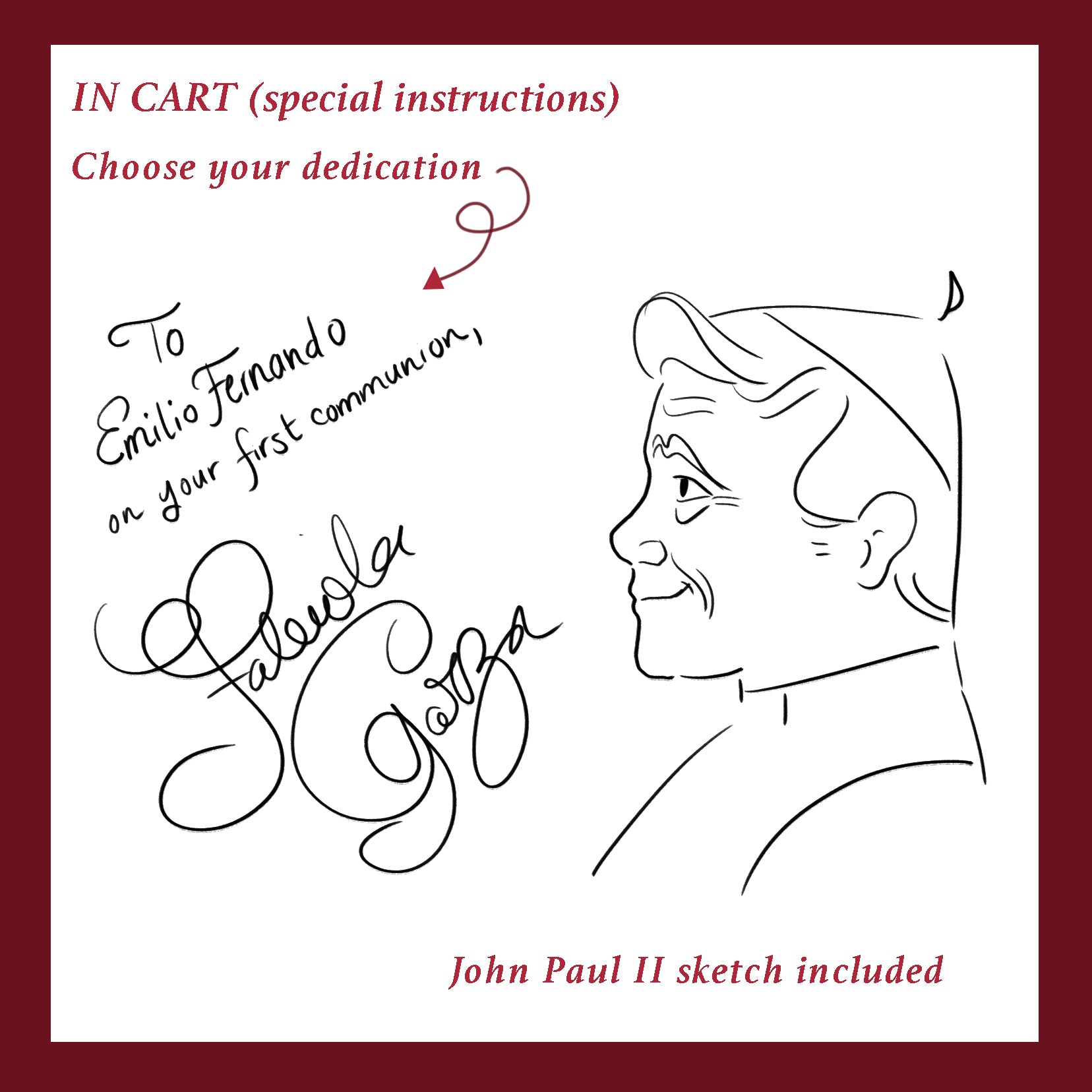 This is a signed edition, with a hand-drawn sketch of Saint Pope John Paul II.